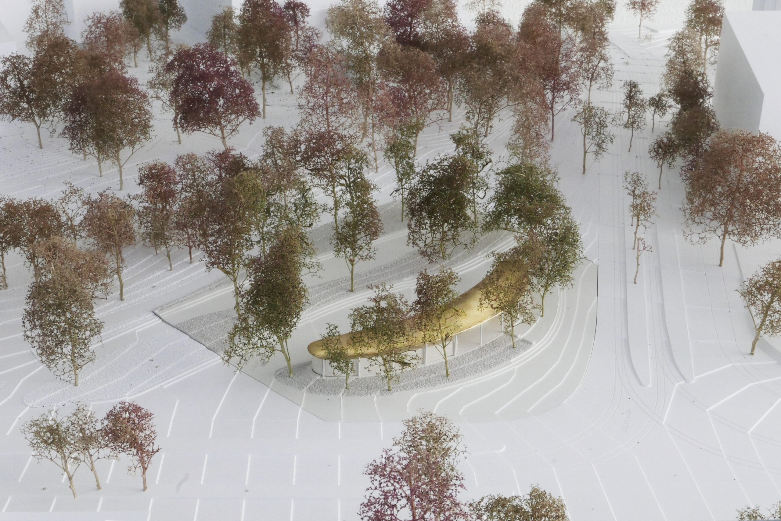 Joséphine est une structure légère qui épouse les figures incurvées de l’aménagement paysager prévu dans le Gloriapark. Son toit en laiton flotte, visible de loin, comme un coussin chatoyant entre les arbres. La face inférieure bombée reflète la végétation environnante et crée un lieu chaleureux à l’atmosphère onirique.
